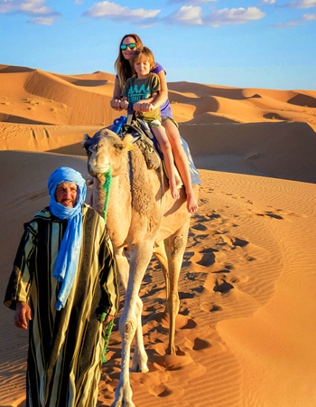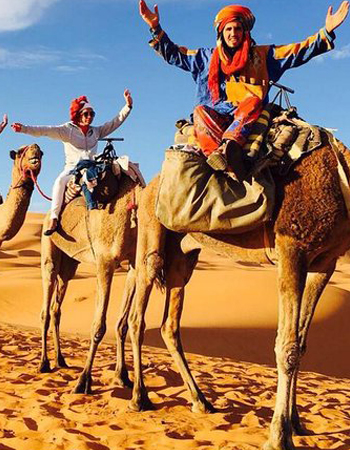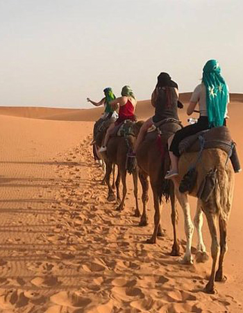 Après le petit-déjeuner, départ vers M’hamid avec arrêt à Tamegroute pour visiter la kasbah souterraine, la bibliothèque coranique et l’atelier de poterie le plus ancien du sud. Puis continuation vers M’hamid pour le déjeuner. À 15h00, départ à dos de chameau pour une balade de 1h30 jusqu’au bivouac, dîner et nuit sous tentes traditionnelles.